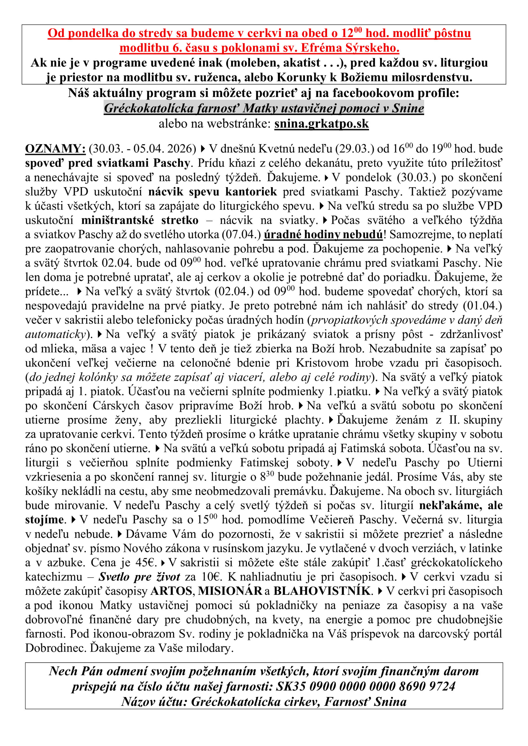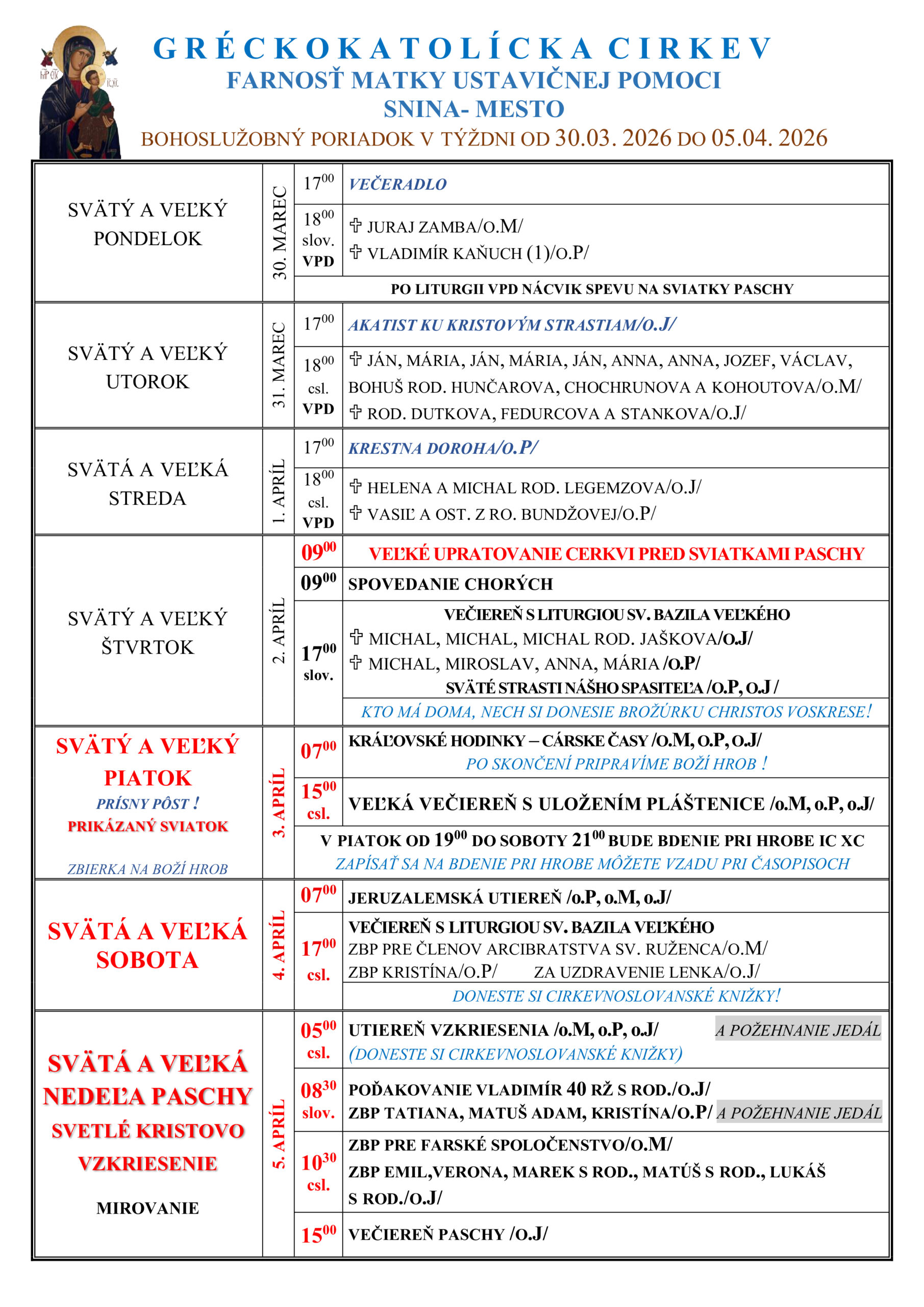 Liturgický program počas sviatkov Paschy 29. marca 2026 Liturgický program počas sviatkov Paschy 30.03. — 05.04.2026